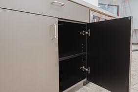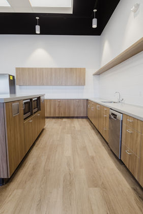 Office and warehouse tenant improvement featuring laminate casework and solid-surface countertops throughout. Including a breakroom island, laminate floating shelves, and a custom 45ft curved control desk.